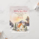 Cette belle et festive invitation d'ouverture de maison de vacances à l'aquarelle met en vedette un cottage rustique hivernal entouré de neige, de montagnes et d'arbres. Il y a des animaux adorables, tels qu'un renard et un loup, ainsi que des champignons, des glands et du feuillage. Le texte combine des écritures manuscrites et des polices sans empattement pour un look élégant et moderne. C'est parfait pour une fête d'hiver ou de Noël.
