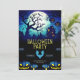 Rejoignez-nous pour une nuit de plaisir effrayant sous la pleine lune ! Cette invitation à la fête d'Halloween est parfaite pour créer une ambiance éffrayante classique. Le design présente une scène merveilleusement lugubre avec une maison hantée et une silhouette d'arbre éffrayante et rongée contre une lune géante et brillante. Les chauves-souris volent dans le ciel étoilé, et des lanternes jack-o' pendent des branches. La partie inférieure de l'invitation est gardée par un carré de citrouilles bleus et quelques araignées déplaisantes et rampantes, invitant les clients à une célébration vraiment hantée.