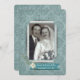 Maison ouverte pour toute année d'anniversaire de mariage avec cadre photo personnalisé du couple. Le fond est un damas de teal scintillant avec un cadre à fente d'angle et un bouquet.