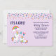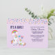 Une invitation à une baby shower avec une licorne maman blanche avec une queue et une crinière colorées fantaisistes. Un bébé licorne allongé à côté d'elle, avec une tétine verte dans la bouche. Un arc-en-ciel coloré avec des nuages duveteux, et quelques étoiles et cœurs décorent ce design doux et adorable. Un contour rose gras entourant l'image lui donne une ambiance gribouillage enfantin. Des points de confettis le long du haut.