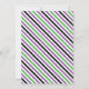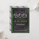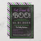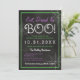 Invitation à la fête d'Halloween conçue comme un tableau de bord avec du texte blanc, violet et vert, des toiles d'araignée, et un dos avec des bandes diagonales dans des couleurs assorties.