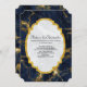Une faire-part de mariage avec un élégant arrière - plan de marbre bleu marine et or. Couché sur le dessus est un cadre avec une fausse bordure en feuille d'or avec votre texte personnalisé à l'intérieur.