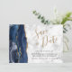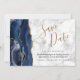 Cette élégante carte de date moderne comporte une bordure en aquarelle bleu marine découpée avec une parties scintillant en faux or. Le texte personnalisable combine écriture manuscrite couleur or avec cuivre noir et polices italiques sur un arrière - plan en marbre blanc et gris. L'envers est assorti d'un design d'agate bleu et or.
