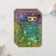 Vous voulez une invitation à la fête d'anniversaire Mardis Gras élégante et festive qui est classe et belle? Ce design, a une parties scintillant étincelante bordure de cadre et de style vintage Or brodé, masque séquencé (NOTE : il s'agit d'une invitation à plat il n'y a pas de parties scintillant d'or ou de feuille métallique ou d'encre utilisée) sur un bokeh riche en profondeur brillant, lumières scintillantes arrière - plan dans le violet profond, riche, bleu, aqua et vert. L'envers est l'arrière - plan de lumières scintillantes correspondant avec le cadre uniquement. Modifiez facilement votre texte à l'aide des champs modèles fournis. Style classique et intemporel avec une touche moderne pour une élégance cravate noire.