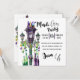 Customisez cette glorieuse invitation de la fête Mardi Gras qui présente un ancien poste de lampe à gaz recouvert de perles Mardi Gras et de masques masqués. Quelque chose que vous pouvez voir dans The Big Easy pendant les festivités du Mardi gras. Audacieux et festif, dorés, verts, violets et un soupçon d'aqua ornent le devant et l'arrière de cette invitation. L'arrière de l'invitation à la fête Mardi Gras également salle feuille pour plus d'informations pour vos invités. Profitez de votre fête Mardi Gras !