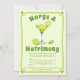 Carton d'invitation pour une fête de mariage avec cocktail Margs & Matrimony et motifs à rayures. Cette invitation moderne présente une charmante illustration d'un verre à cocktail margarita orné de tranches de citron vert, capturant parfaitement l'esprit d'une fête de mariage amusante. Le fond présente un motif vibrant à rayures vertes et blanches qui ajoute une touche rafraîchissante, évoquant des sentiments de chaleur et de joie. L'invitation est entourée d'une bordure fantaisiste verte citron gribouillée, ornée de cœurs ludiques, qui ajoute une touche romantique au design global. Cette invitation n'est pas seulement un élément de papeterie ; c'est une invitation à une célébration sincère de l'amour et de l'amitié, qui donne le ton à un événement inoubliable.