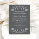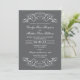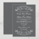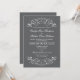 Une invitation de mariage portrait dramatique avec des fioritures de défilement ornées blanches sur un fond gris riche. La palette de couleurs inversée donne à ce design de filigrane classique une touche moderne audacieuse tout en conservant son élégance traditionnelle. Tout le texte et les détails sont entièrement personnalisables.