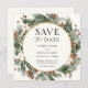Élégant thème hivernal L'invitation Save the Date présente un cadre doré entouré d'aquarelles à feuillage persistant, de pins et de fleurs d'hiver. Personnalisez avec vos informations ou cliquez sur "Cliquez pour customiser plus loin" pour modifier les styles, la taille et les couleurs des polices. Objets correspondants disponibles dans la boutique Adore Paper Co Zazzle.