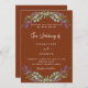 Un arrière - plan tendance couleur terre cuite décoré de fleurs de lavande et de verdure d'eucalyptus. Personnalisez et vos noms et détails.