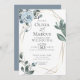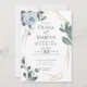 Faire-part de mariage | roses, feuilles et baies d'aquarelle dans un bleu poussiéreux moderne entourent un cadre géométrique de terrarium en or avec une végétation sauge. Reverse est un bleu poussiéreux gratuit. Personnaliser texte, style de police, couleur et taille. OEuvre originale créée pour BarefootBride™ par © WhimsicalArtwork™ - Il s'agit d'une suite de papier à lettres Mariage complète avec papier à lettres mariage, baby shower et autres articles de papeterie d'événements correspondants.