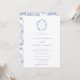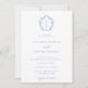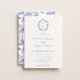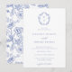 Monogramme de crête bleu Régence, invitation de mariage. Inspiré de l'ère Régence, monogramme de crête d'art linéaire baroque. Caractéristiques, un style de typographie bleu élégant mélangeant écriture et caractères gras. Modèle de jardin de style chinoiserie en arrière-plan.