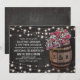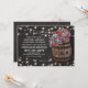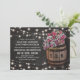 Cartes d'invitation de mariage champêtre élégant avec un fond de tableau noir rustique, des guirlandes lumineuses, des roses roses et des fleurs de gypsophile, un tonneau en bois de vignoble avec vos initiales et un morceau de ficelle nouée.