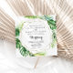 Cette faire-part de mariage géométrique de destination avant et arrière est parfaite pour un mariage tropical. Le design se compose de palmiers verts aquarelés peints à la main et de feuilles de bananes soigneusement arrangés en de beaux bouquets, ornant un cadre géométrique doré. Enregistrez du papier en incluant plus de détails au verso de l'invitation plutôt que sur une carte de boîtier séparée.