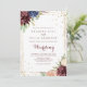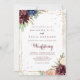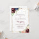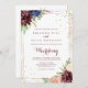 Cette parties scintillant d'or géométrique à l'avant et à l'arrière est parfaite pour un mariage rustique. Le design se compose de l'aquarelle dessinée à la main violet, marine, rousse, bordeaux, fleurs marines, feuilles verts et or, ornant un cadre géométrique élégant. Enregistrez du papier en incluant plus de détails au verso de l'invitation plutôt que sur une carte de boîtier séparée.