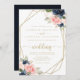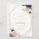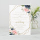 Cette faire-part de mariage marine de couleur or géométrique avant et arrière est parfaite pour un mariage rustique. Le design présente de belles peintes à la main bleu foncé, bleu marine, rose, rousse, fleurs d'or et feuillage vert, entassées dans d'élégants bouquets, ornant un cadre géométrique. Enregistrez du papier en incluant plus de détails au verso de l'invitation plutôt que sur une carte de boîtier séparée.