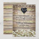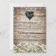 Cartes d'invitation de mariage chic campagne avec un fond de grange en bois rustique, fleurs de gypsophile blanches, guirlandes lumineuses scintillantes et un modèle de mariage moderne.
