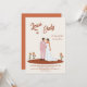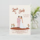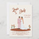 Antique invitation de mariage élégante sur arrière - plan beige avec une mariée gracieuse et mariée entourée de fleurs orange vibrantes, évoquant la chaleur et l'amour.