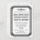 Ces invitations de mariage présentent une palette de couleurs noir et blanc, un cadre géométrique et d'autres détails stylistiques, tous inspirés de l'Art Déco et des années folles. Vous pouvez customiser les champs de texte d'exemple à votre convenance.