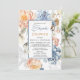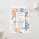 Cette conception présente une aquarelle illustrant des pêches pâles et des fleurs bleues rousses avec des confettis dorés sur le dessus.