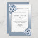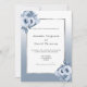 Sur le devant : Un arrière - plan sombre bleu et blanc poussiéreux avec un faux cadre argenté. Décoré de fleurs aquarelles, de fleurs aux tons bleus. Modèles pour les noms de la mariée et du marié et les détails du parti. Le texte est écrit avec des lettres de couleur noire. Dos : arrière - plan bleu poussiéreux.