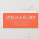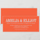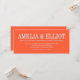 Cette invitation de mariage présente les noms des mariés en gros caractères gras sur toute la largeur d'une carte paysage en lettrage bleu frais sur un fond kaki chaud, avec la date, le lieu et les détails du mariage en plus petits caractères nets en dessous. Les noms sont tout le spectacle - c'est un excellent choix pour un couple qui veut quelque chose de gras, coloré et un peu inattendu.
