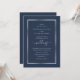 Elégant faire-part de mariage bleu marine et argent avec une police script moderne. Personnalisez facilement cette carte mariage moderne avec vos détails mariages dans un cadre argenté.