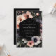 Adoptez une atmosphère dramatique et romantique avec ce design floral élégant. Les anémones lumineuses blush, pêche et pervenche s'épanouissent sur un fond sombre et profond, créant un effet de clair-obscur saisissant. Les pétales doux et la verdure délicate sont représentés dans un style pictural doux, offrant une touche de drame sophistiqué pour votre union spéciale.