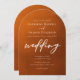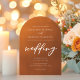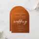 Faire-part de mariage orange brûlé rustique avec élégante typographie blanche sur le dégradé de couleur marron sur cette carte arc. Ces tons de terre viennent parfaitement compléter un mariage d'automne bohème minimaliste.