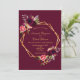 Devant : Un arrière - plan bordeaux avec un cadre géométrique en faux or. Décorée de fleurs bordeaux foncé et roses, de plumes roses et boho. Modèles pour Vos noms et les détails mariages. Les noms sont écrits avec un script de style écrit à la main, des lettres d'or. Dos : arrière - plan de couleur bordeaux foncé.
