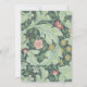Le texte est écrit dans un ovale vert clair, avec une bordure dorée, avec des lettres dorées, sauf les noms, qui sont verts. L'occasion "Mariage" est écrite dans un script calligraphique, le reste en casquette. L'arrière - plan est le motif de papier peint "Leicester" de Morris & co (par le designer britannique John Henry Dearle (1859-1932) basé sur une oeuvre de William Morris), de 1912, maintenant dans le domaine public.Il est dominé par des feuilles verts sur un arrière - plan foncé, mais a aussi quelques fleurs rouges, blanches et jaunes.