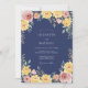 Un fond bleu marine profond crée une scène sophistiquée pour des florales aquarelles vibrantes dans des tons de jaune ensoleillé, pêche et rose tendre. Des roses peintes, des ranunculus et un feuillage vert délicat créent une atmosphère romantique. Ce design botanique met en valeur une élégante maîtrise artistique grâce à des coups de pinceau doux et un contraste de couleurs riche.