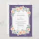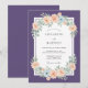Cette conception présente un fond prune profond associé à des florales aquarelles douces. Des roses pêche délicates et des anémones bleu clair sont nichées parmi le feuillage d'eucalyptus vert sauge atténué. La palette de couleurs romantiques et le style élégant créent une ambiance sophistiquée pour un événement printanier ou estival. Des éléments botaniques luxuriants offrent une esthétique intemporelle pour une affaire classique.