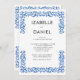 Cette invitation de mariage tendance présente un cadre ornemental vintage bleu avec des fleurs bleues. Profitez-en !