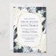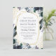 Faire-part de mariage élégants avec un fond blanc tendance qui peut être changé en n'importe quelle couleur, des fleurs bleues bohèmes rustiques à l'aquarelle, un cadre géométrique doré, une touche de paillettes dorées et un modèle de mariage moderne.