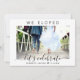 Faire-part moderne de mariage intime ou privé et invitation à une réception ou une fête de célébration de mariage. Le recto présente votre photo et « Nous nous sommes enfuis, célébrons » dans un mélange de typographie simple et d'écriture tendance, ainsi que vos prénoms et la date du mariage. Au verso, vous pouvez personnaliser votre annonce de mariage et votre invitation avec plus de détails et ajouter vos noms dans une écriture ressemblant à une signature.