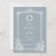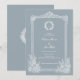 Donnez le ton raffiné et romantique de votre jour spécial avec ce faire-part de mariage élégant à cadre orné vintage bleu poussiéreux, orné d'une délicate bordure botanique en ligne blanche, d'un cadre décoratif sophistiqué et d'un monogramme personnalisé au centre. Ce design intemporel allie l'élégance classique du mariage à une touche de charme champêtre français, ce qui en fait l'introduction parfaite à votre célébration de mariage.