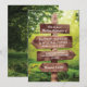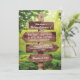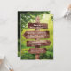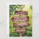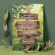Faire-part de mariage botanique fantaisiste représentant un cadre romantique et magique de forêt, des guirlandes lumineuses et vos informations de mariage écrites sur un panneau indicateur en bois rustique.