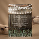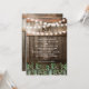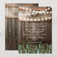 Invitation de mariage rustique avec feuillage vert mettant en vedette une grange de campagne, fond de tonneau en chêne foncé, guirlande lumineuse, votre monogramme, feuillage botanique vert, et un modèle de mariage moderne facile à personnaliser.
