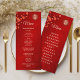 Des fleurs de cerisiers rouges et un double symbole de bonheur doré sur un arrière - plan rouge chatoyant. Avec des noms de mariée et de mariée personnalisés, la date du mariage et un texte de menu personnalisé. A l'arrière, on trouve un texte chinois traditionnel.
