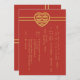 Des lignes épurées modernes et contemporaines avec des éléments traditionnels de mariage chinois, cette invitation de mariage est idéale pour les couples chinois qui se marient ! Le caractère chinois signifiant double bonheur, utilisé pour le bonheur conjugal, est intégré dans une forme de cœur. Le texte jaune doré faux contraste joliment avec le fond rouge. Personnalisez facilement avec vos détails de mariage en texte chinois !