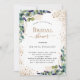 Bienvenue à une élégante fête de mariage. Un fond blanc chic. Décoré de feuilles d'eucalyptus aquarellées vertes, de brindilles, de verdure, de feuilles dorées fausses et de poussière de paillettes dorées. Personnalisez et ajoutez le nom de la future mariée et les détails de la fête. Lettres noires et dorées.