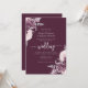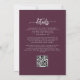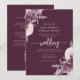 Cette élégante invitation de mariage présente des bouquets de fleurs mauves mis en valeur par de la verdure en faux feuillet argenté dans deux coins, sur un fond violet mauve foncé. Le texte personnalisable combine des polices sérif, italique et écriture manuscrite gris argenté. Le verso offre un espace pour les détails du mariage sur un fond uni, ainsi qu'un code QR que les invités peuvent scanner pour visiter votre site web et répondre, ce qui permet d'économiser le coût d'impression et d'envoi de cartes-réponses séparées.