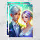 Beau couple avec accents turquoise, violet et bleu accents anime faire-part de mariage à thème.