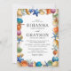 Faire-part de mariage plage nautique avec un fond blanc élégant qui peut être changé en n'importe quelle couleur, étoiles de mer et coquillages colorés, et un modèle de texte de mariage moderne facile à personnaliser.