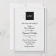Elégant, toutes saisons, faire-part de mariage en noir et blanc, avec un look aquarelle de texture papier. Les monogrammes blancs de mariée et de mariée décorent un carré noir, en haut de l'invitation et un cadre noir mince entoure le côté avant. L'arrière de l'invitation est fait en noir sur motif damassé floral noir. Personnalisez tous les champs de texte pour votre journée spéciale. Des produits mariages correspondants sont disponibles.