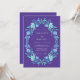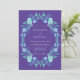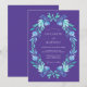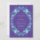 Un riche fond violet est orné d'une délicate couronne en cascade de fleurs et de feuillages aquarellés dans des tons d'aqua et de bleu doux. Ce design évoque un sentiment de beauté botanique enchanteresse.