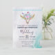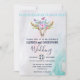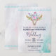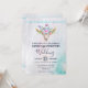 Une invitation de mariage avec un fond aquarelle turquoise et pastel. Un crâne d'animal boho chic avec un bouquet floral sur la tête et de petits papillons qui voltigent. Une bordure décorative mignonne avec de petites formes de gouttes en bleu clair.