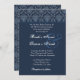 Cette damassé bleue de minuit fait un faire-part de mariage élégant. Vous pouvez expérimenter avec différents types de papier pour obtenir juste le regard que vous voulez. Je recommande le papier de toile, ou le papier métallique hued de glace qui donne à votre invitation un miroitement et un éclat spéciaux. Cette invitation vient avec une enveloppe classée par A7.
