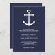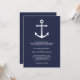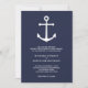 Suite de Faire-part de mariage d'Ancres bleu marine moderne : Faire-part de mariage avec ancre blanche avec détails mariages en blanc, police sans serif moderne sur arrière - plan bleu marine. Parfait pour les mariage nautiques, les mariages à thème de plage et plus.