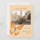 Simple. Moderne. Élégant. Beau mariage Orange Monarch Enregistrer l'invitation Date avec photo. Cette invitation de mariage présente une aquarelle illustrant un papillon serein volant vers un soleil éclatant de rayons solaires. Les tons orange, marron et crème sont agréables. Modifiez cette carte avec une photo du couple engagé.
